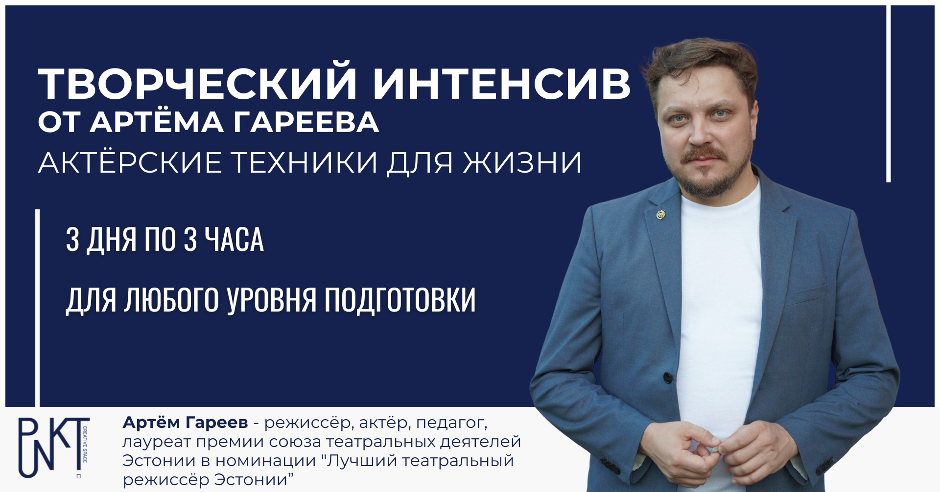 Курс ведёт Артём Гареев — режиссёр, актёр, педагог, руководитель творческого пространства PUNKT, лауреат премии союза театральных деятелей Эстонии в номинации ”Лучший театральный режиссёр Эстонии”